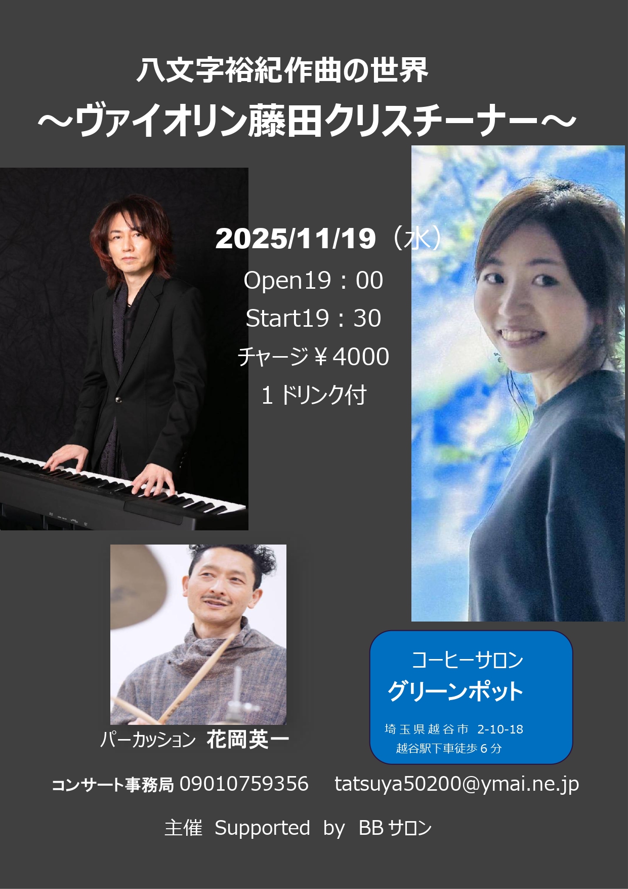 開催日:2025年11月19日(水)場所:コーヒーサロン グリーンポット時間:open19:00 / start19:30料金:LIVE Charge4000円(ドリンク1杯付き)出演:八文字裕紀(ピアノ)、花岡英一(パーカッション)